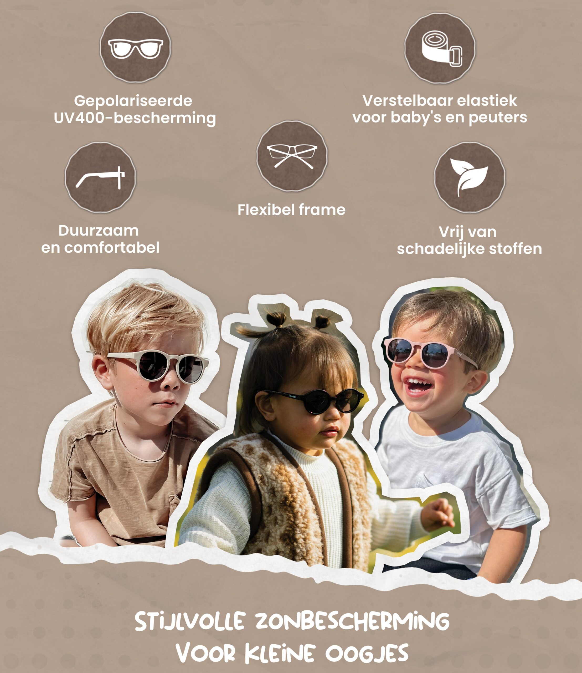 Deze zonnebrilletjes zijn speciaal ontworpen voor baby’s en jonge kinderen. Ze bieden de ultieme UV400-bescherming en een comfortabele pasvorm. Ideaal om gevoelige oogjes veilig te houden, of ze nu in de kinderwagen liggen of vrolijk spelen in het zonnetje.